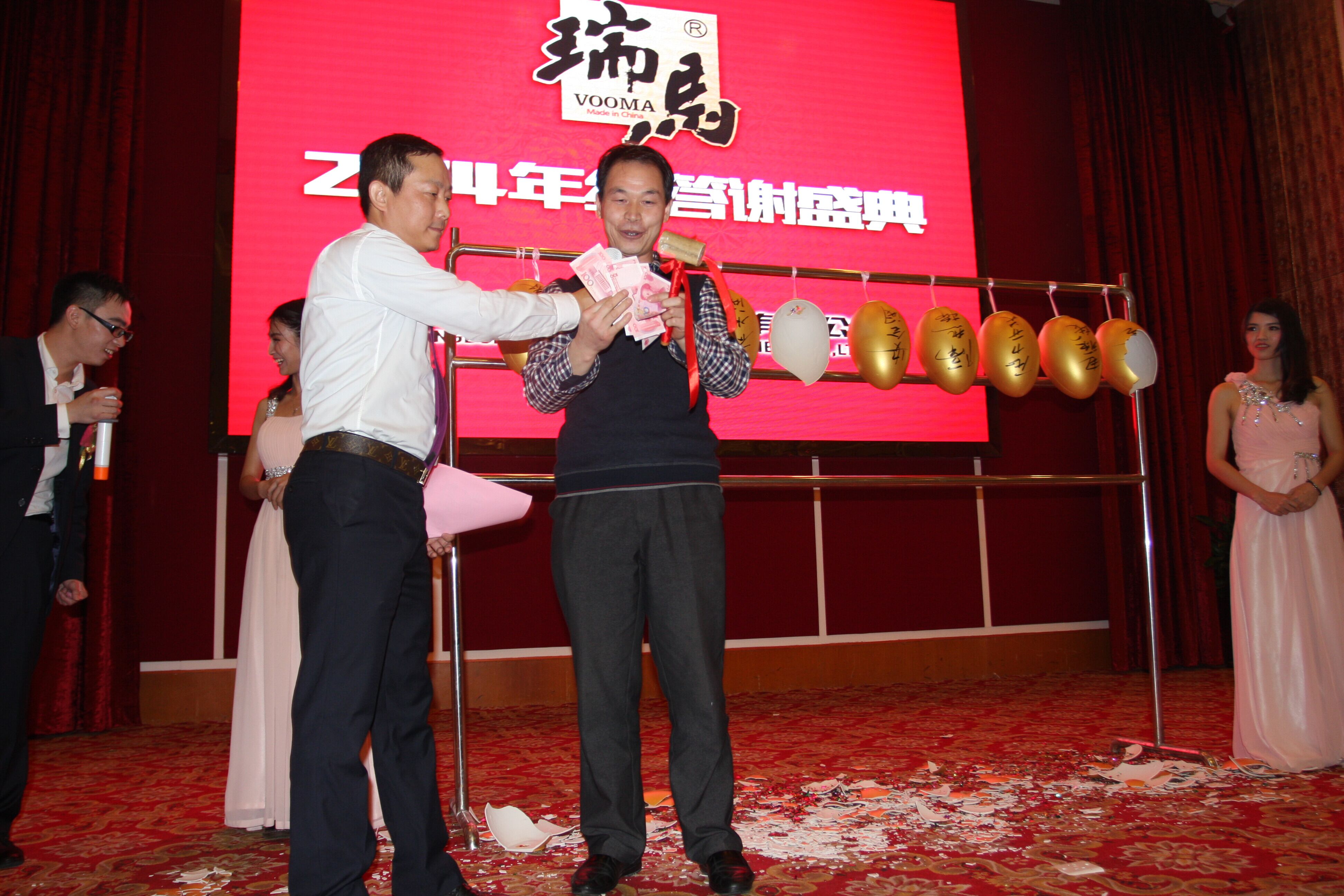 節(jié)目表演完后,當然是來到我們最刺激,最期待的砸金蛋抽獎環(huán)節(jié)!看著一個個金蛋搬上臺,大家眼睛都閃亮亮的!沒錯,瑞馬公司就是那么任性,讓您砸的就是一個真正的金蛋,里面可是那人見人愛 “白花花”的人民幣!